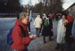 Das andere Mauerstück hängt heute noch an meiner Pinnwand. Wir gehen weiter an der noch real existierenden Mauer entlang. Volksfeststimmung macht sich breit. Jemand hat einen improvisierten Glühweinstand aufgestellt.. Nicht weit davon ist eins der ersten Löcher in der Mauer, gerade handbreit. Auf der anderen Seite sehe ich zwei Volkspolizisten. Ich kaufe zwei Becher Glühwein und reiche sie durch das Loch. Die Vopos nehmen an. Wir prosten uns zu. Später schickt mein Vater mir einen Zeitungsausschnitt. In der Rheinischen Post ist ein Foto von mir abgebildet. Ein Fotograf von Associated Press hat mich beim Hämmern abgelichtet. "Mauerspecht" steht unter dem Bild. |